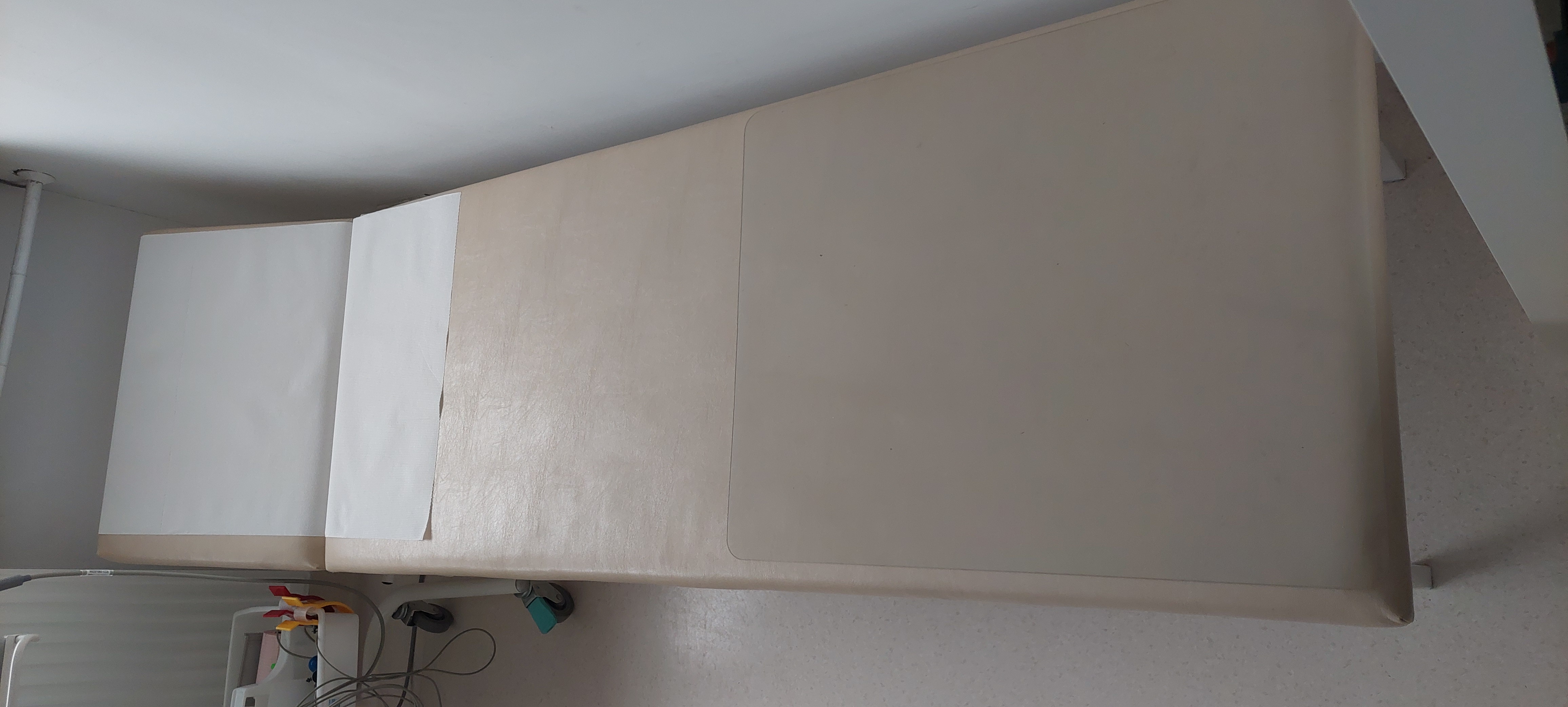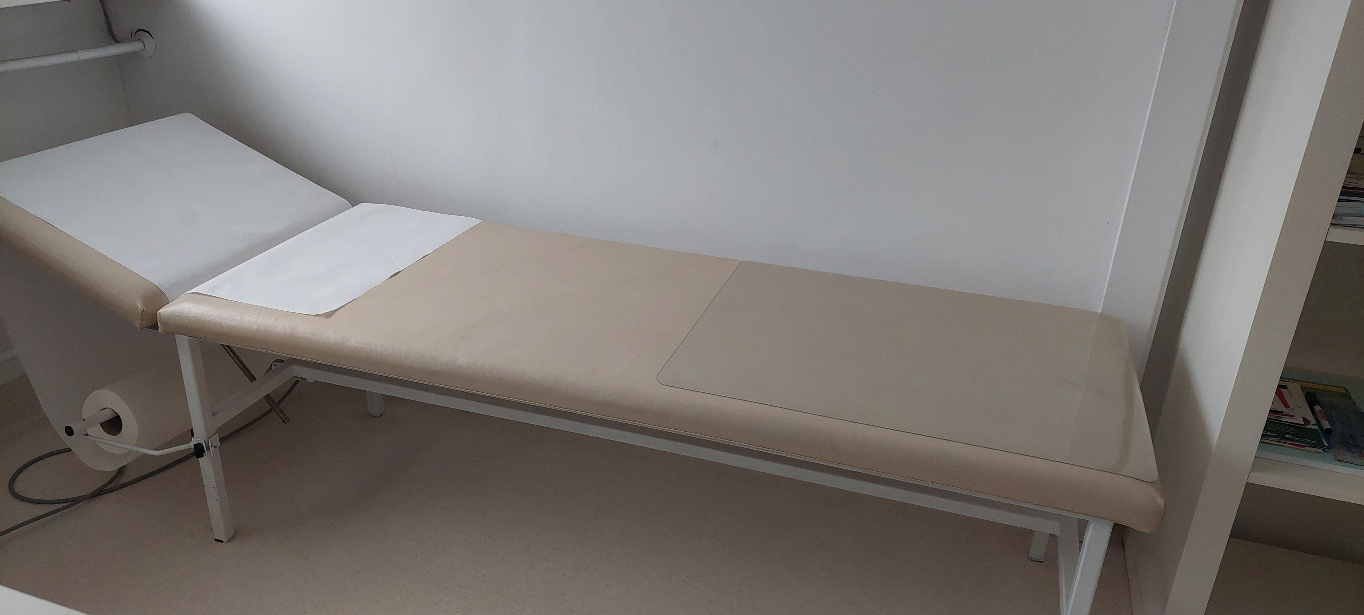Kozetka lekarska ma konstrukcję metalową malowaną na biało.