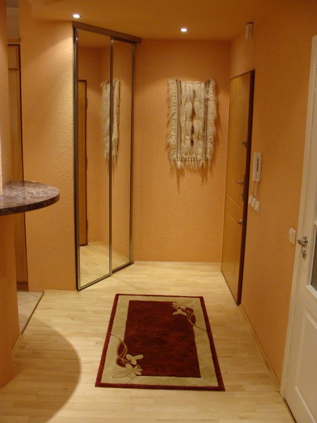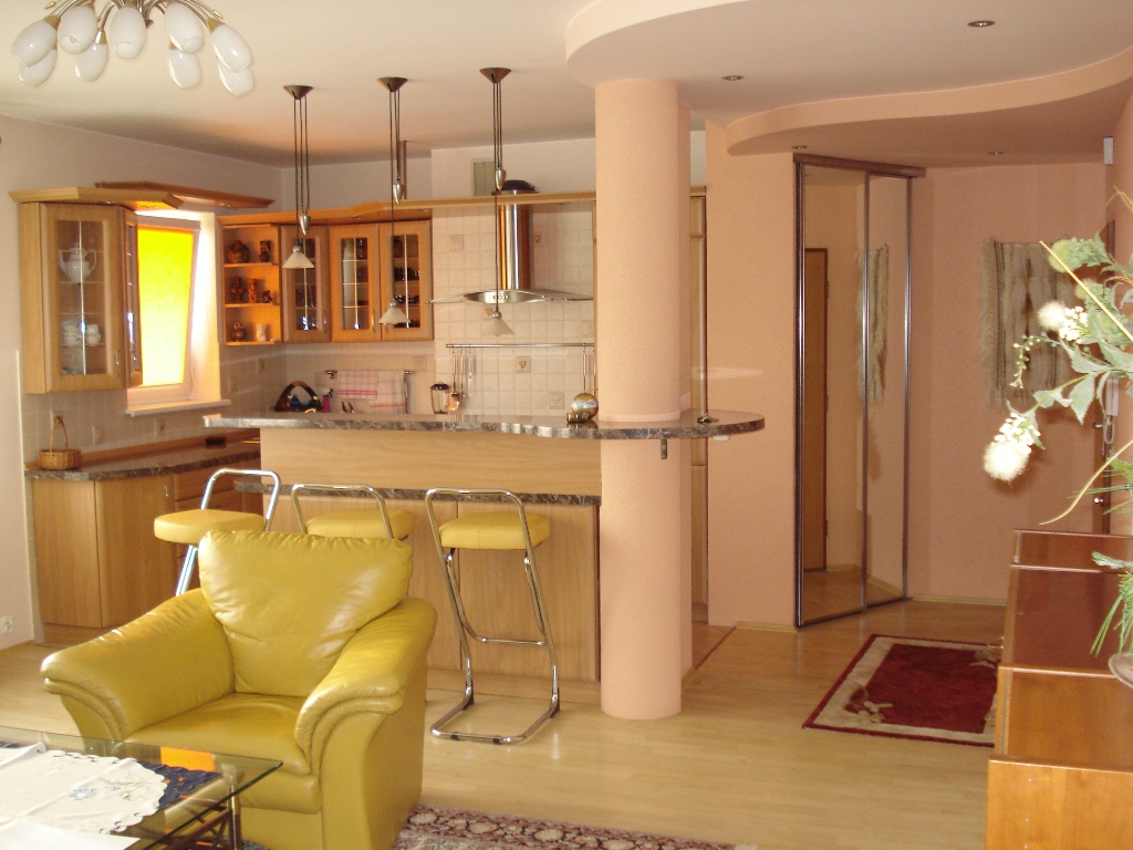 Salon/duży pokój połączony z kuchnią, oddzielony barem. Sufit podwieszany, parkiet drewniany bukowy, szafa komandor z lustrem.