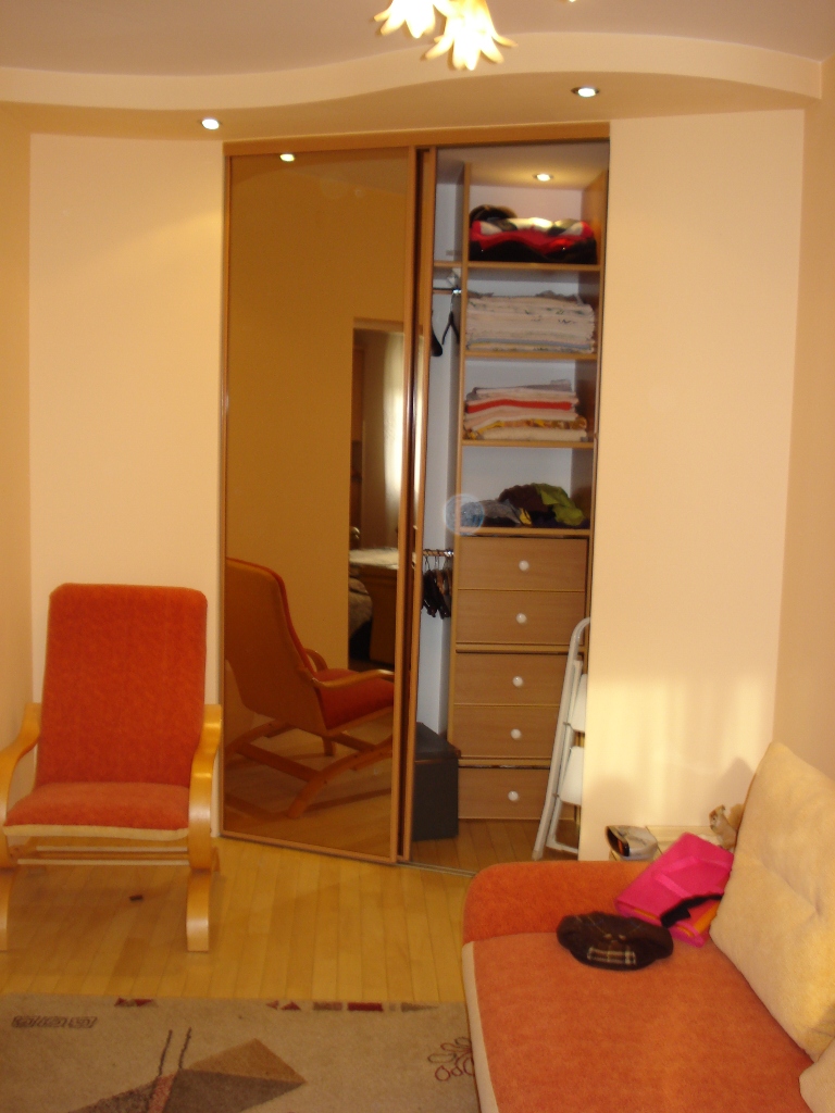 Sypialnia/mniejszy pokój (bez problemu do przerobienia na dziecięcy). Sufit podwieszany, parkiet drewniany bukowy. Szafa-garderoba, bardzo pojemna, zabudowana lustrzanymi drzwiami przesuwnymi. Zainstalowane udogodnienia do przechowywania odkurzacza i żelazka.