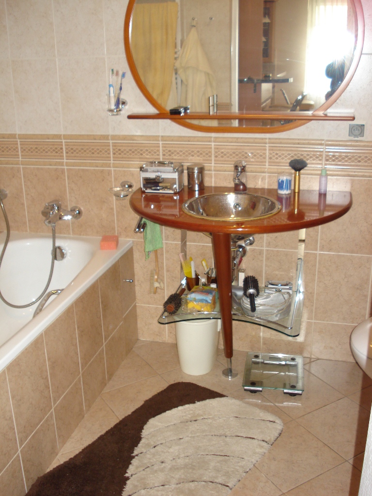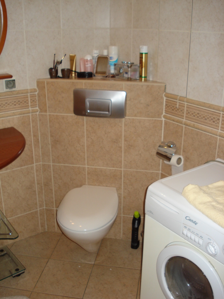 Łazienka w pełni wyposażona. Kafle włoskie, eleganckie wykończenie. Wanna, umywalka wbudowana w konsolę - oryginalny włoski mebel, toaleta z zabudowaną spłuczką, pralka.